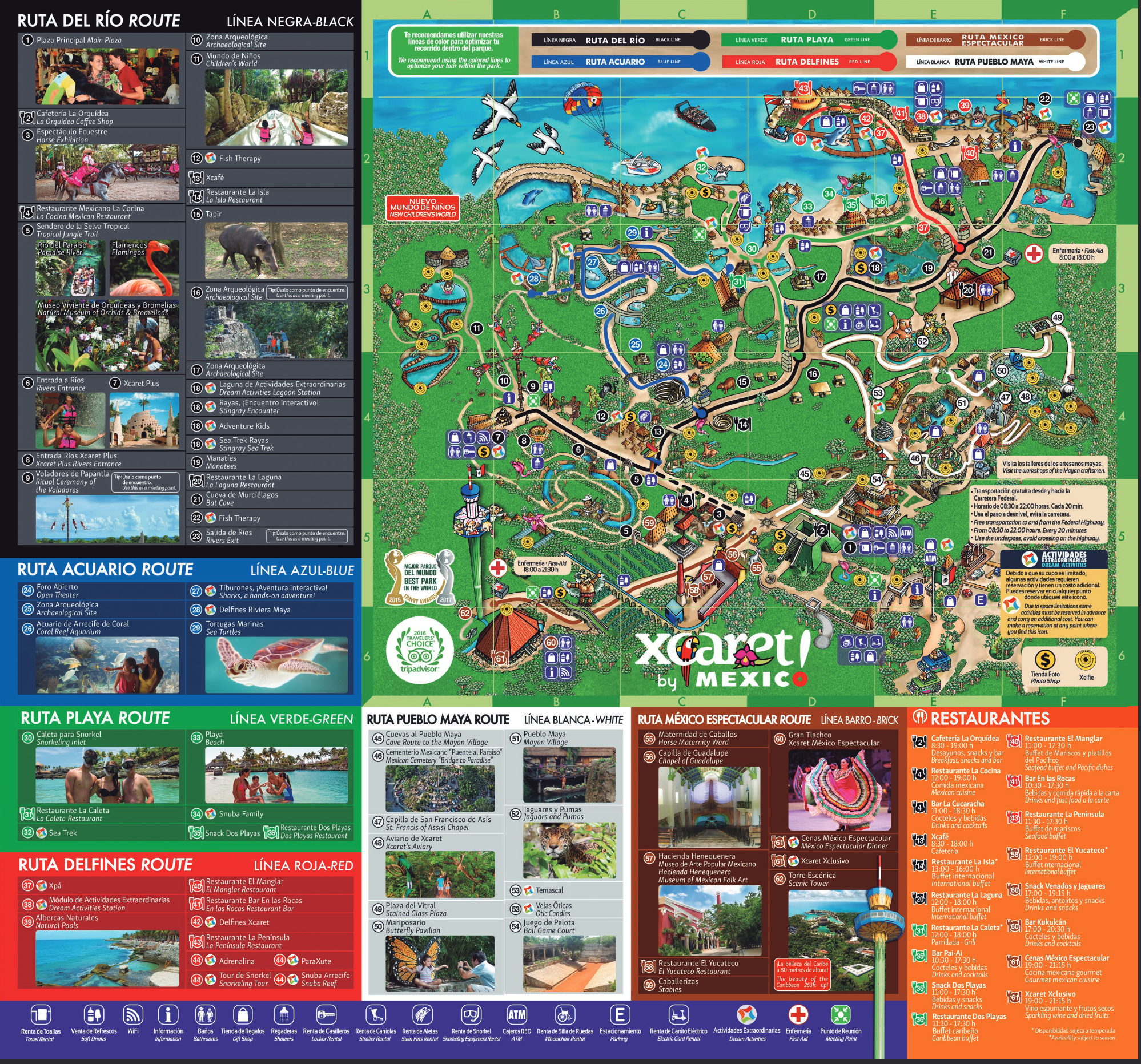 Os visitantes, ao passear pelo parque, têm oportunidade de seguir as linhas coloridas, cada uma como uma rota temática: a rota do rio, do aquário, da praia, dos golfinhos, do pueblo Maya, e, finalmente, a dedicada ao espectáculo Xcaret Mexico Espectacular.