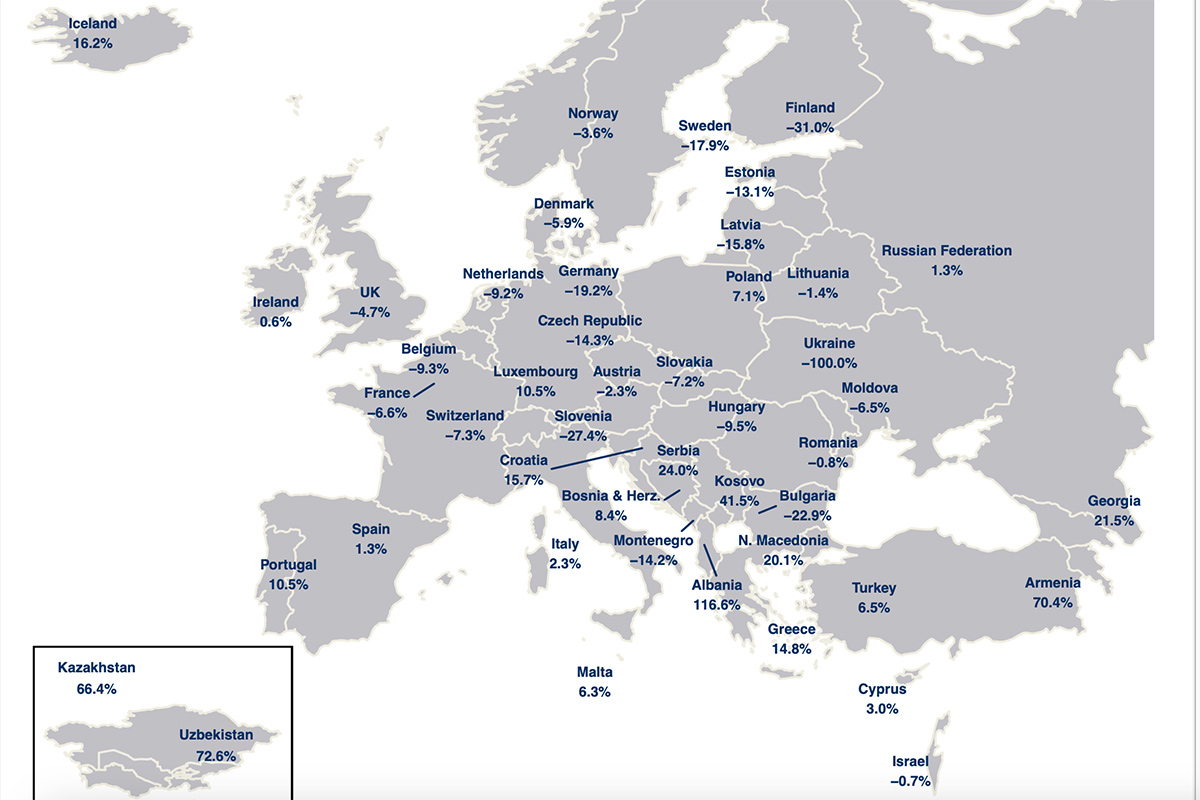 Os aeroportos europeus ainda ficaram aquém da pré-pandemia no mês de Julho, com menos 3% de passageiros, principalmente pelo decréscimo em 4,3% nos aeroportos dos 27 países da União Europeia e Islândia, Noruega, Suíça e Reino Unido.