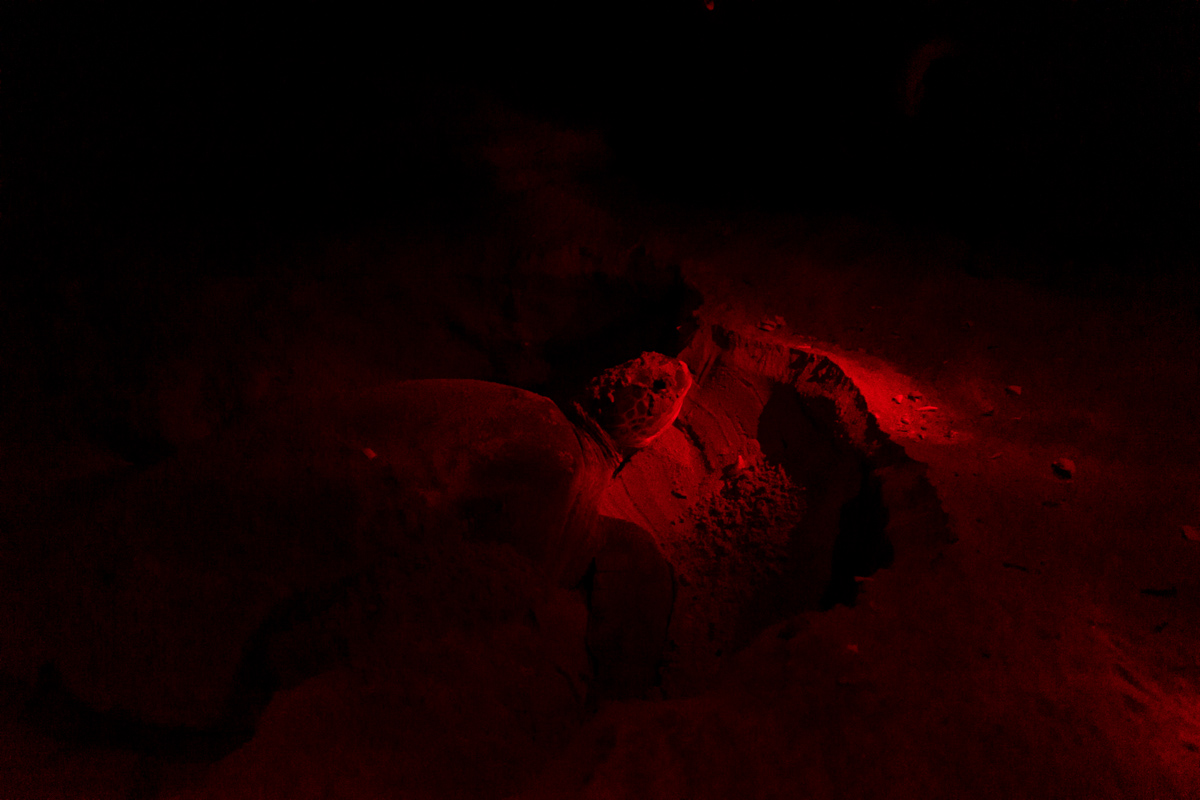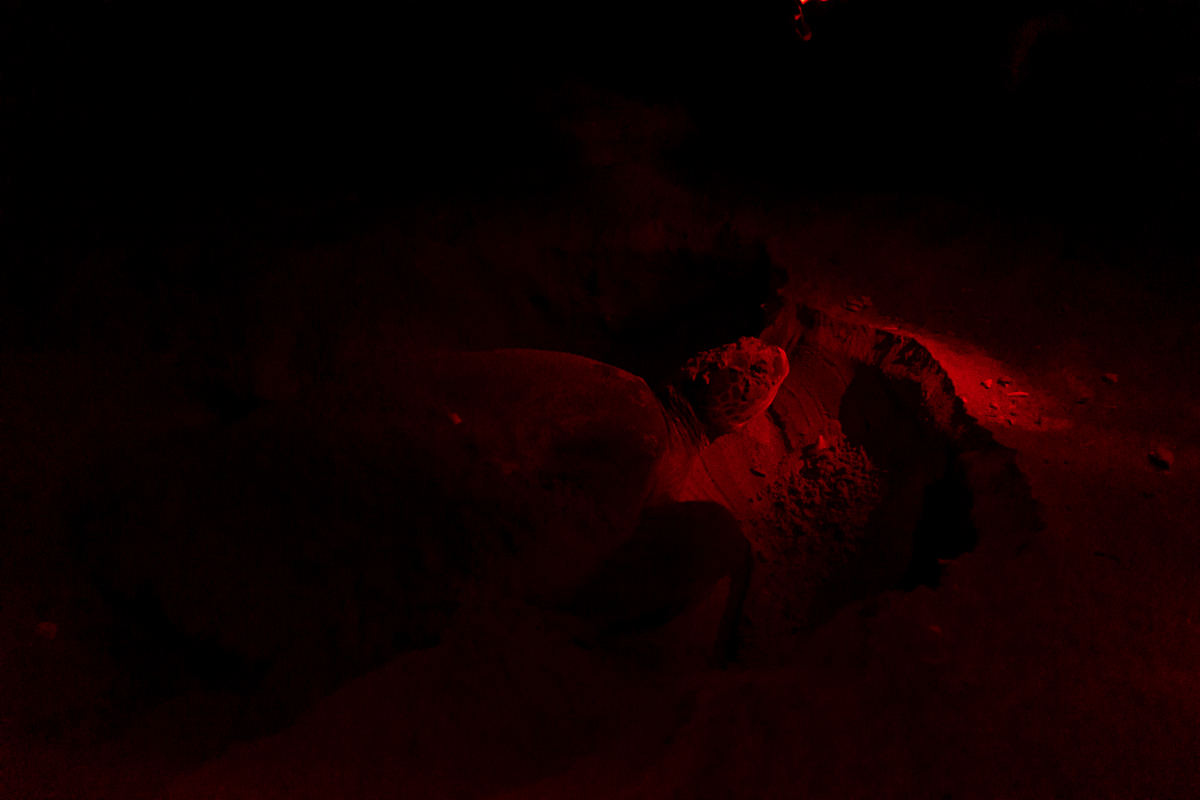 Tivemos a sorte, creio eu, de avistar cinco tartarugas verdes a colocar ovos, a fazer o ninho com as suas habilidosas patas traseiras, e a regressar ao mar depois deste processo moroso e cansativo.