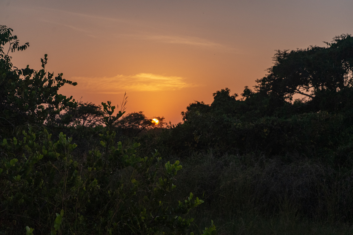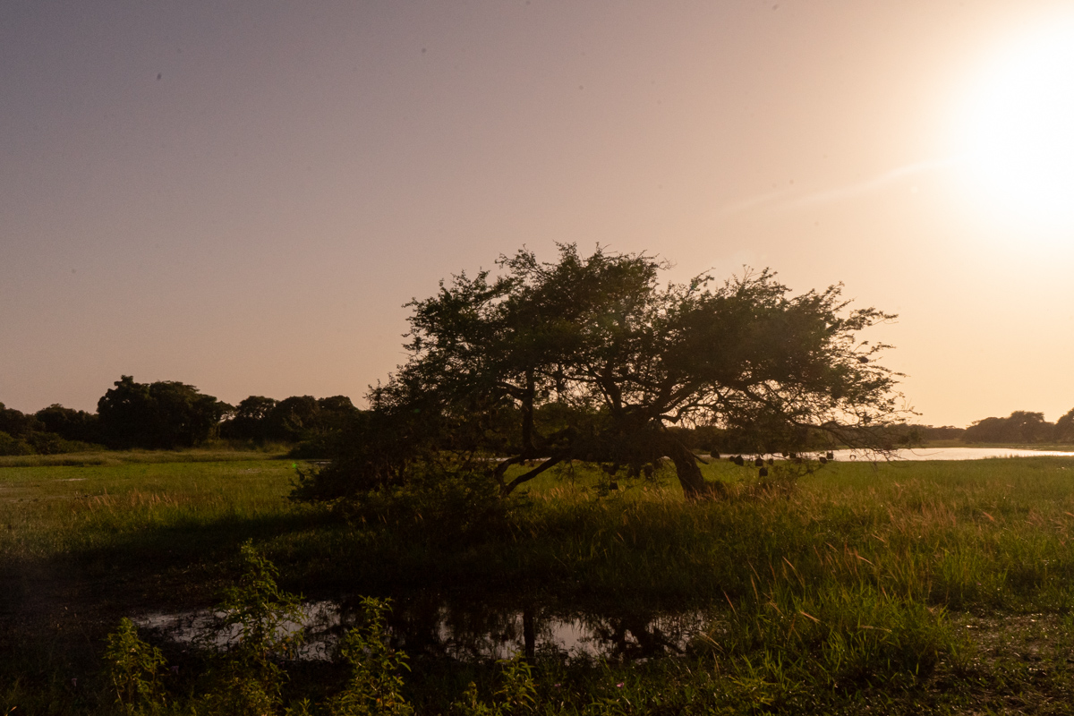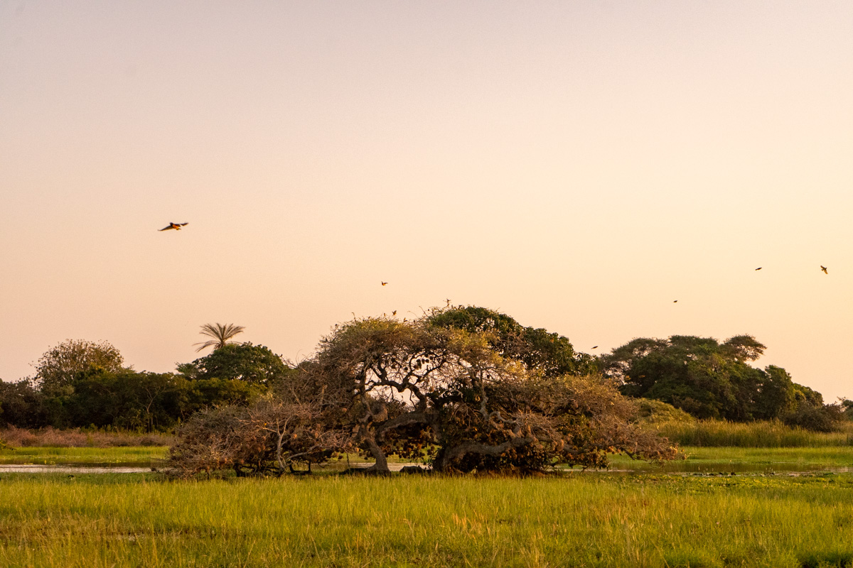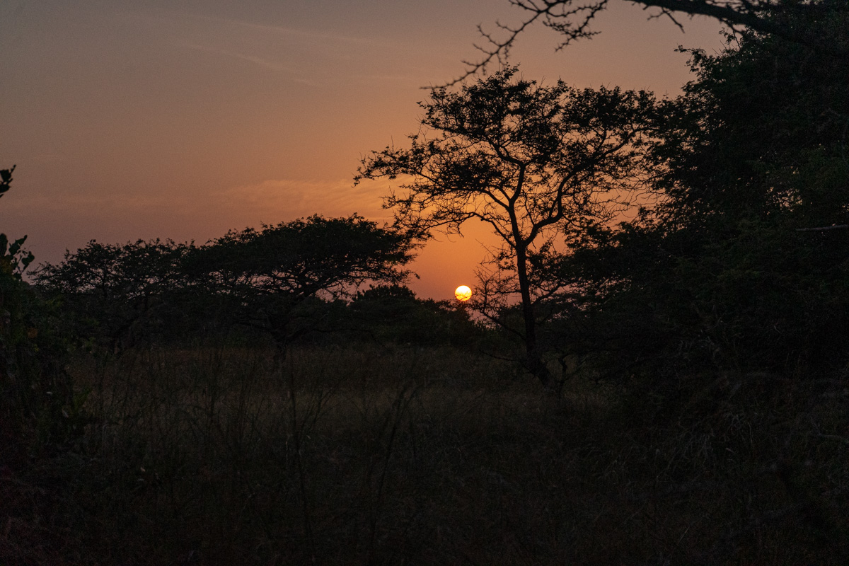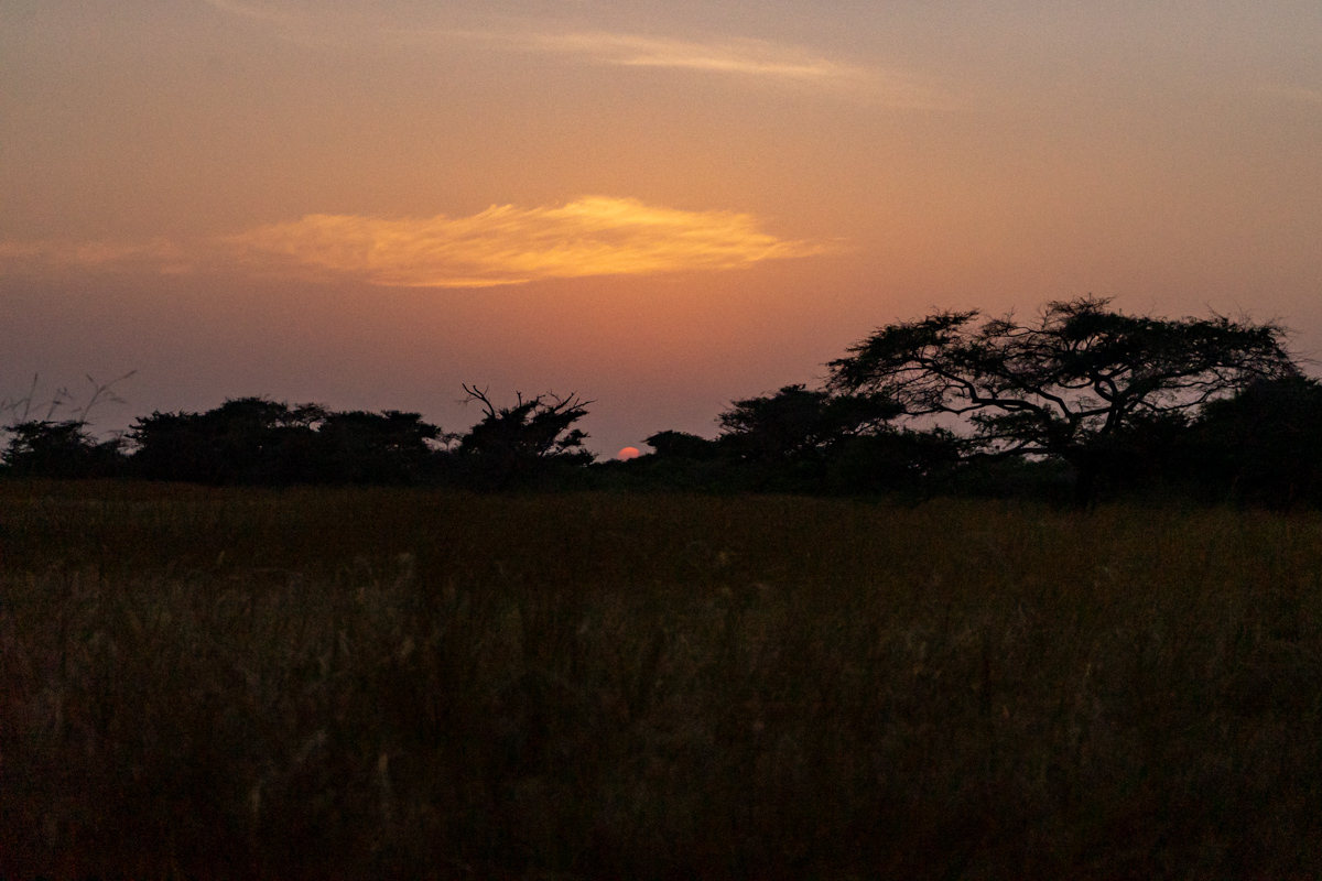 Quando chegámos à praia onde se encontrava o barco, o dia estava a terminar e tivemos o nosso pôr do Sol africano, na savana. O cenário era magnífico, mas vê-lo levantou um problema mencionado acima: não se navega à noite com estas embarcações, por causa dos bancos de areia.
