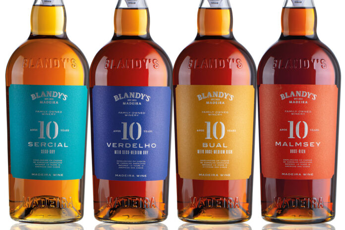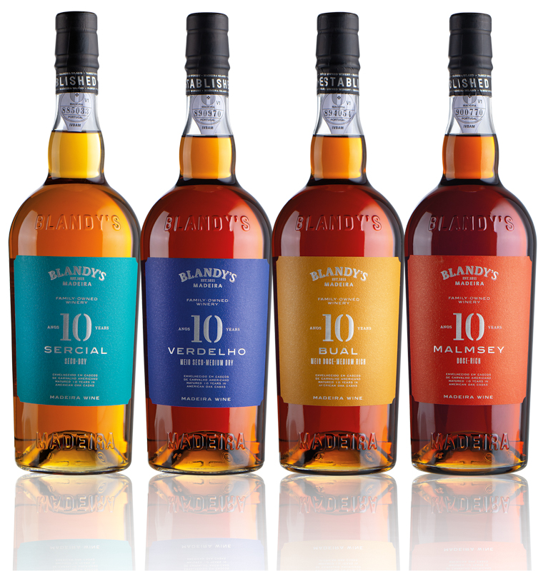 A Blandy’s Madeira está a apresentar a sua nova linha de vinhos Madeira 10 anos, com garrafas transparentes e rótulos coloridos que identificam a variedade do vinho.