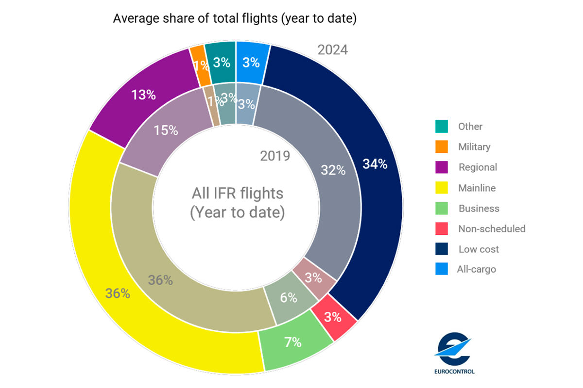 Em número absoluto de voos, apesar de dar uma quota maior às ‘mainline’, o Eurocontrol aponta em número de voos inferior ao das low cost, com 11.975 para estas e 11.901 para as também chamadas ‘tradicionais’.