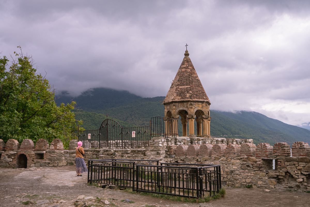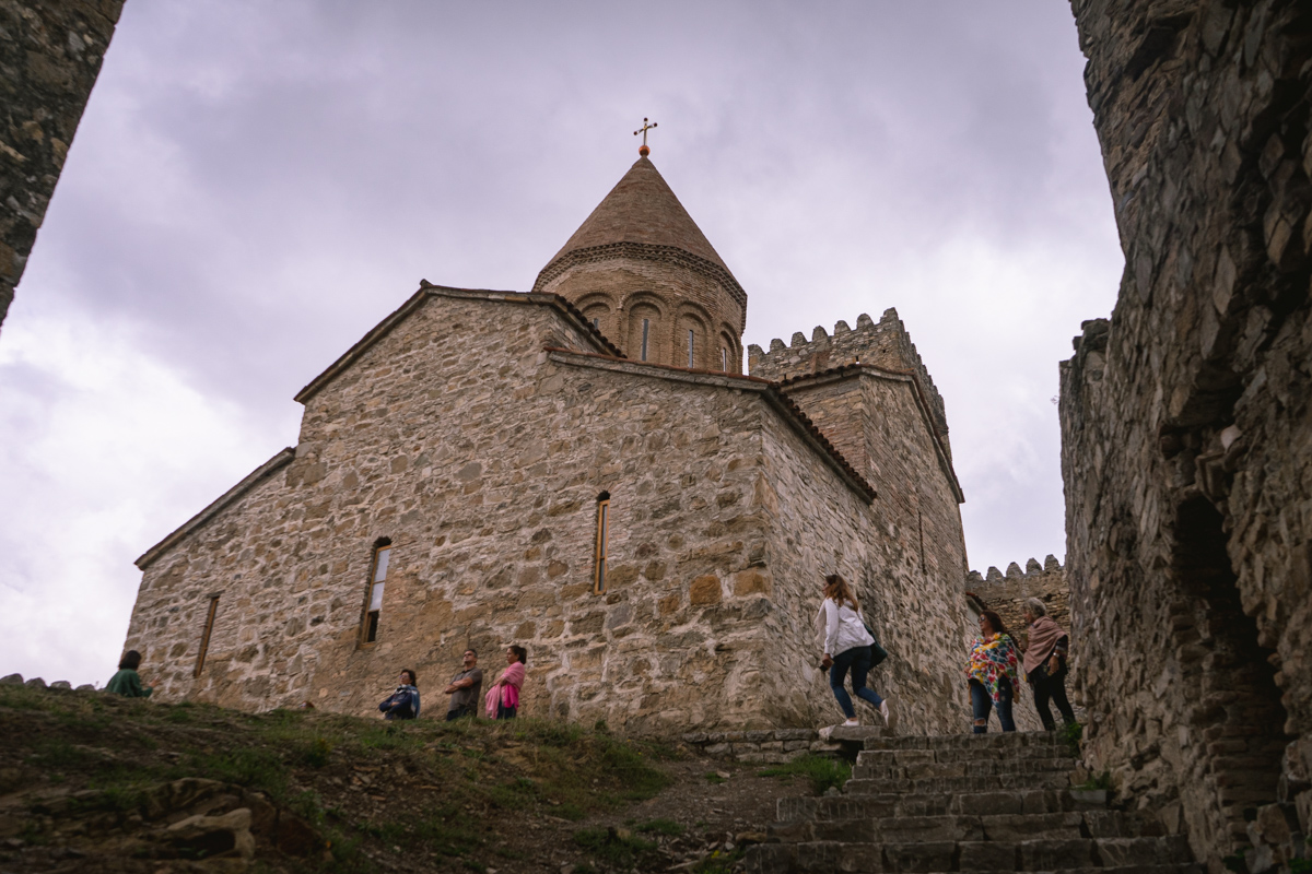 Observamos a ‘Noiva’ (Kazbegi) a partir da Igreja da Trindade de Gergeti, um monumento do século XIV e onde a população guardava os bens mais valiosos quando a região era invadida. A sua posição estratégica permitia vantagens defensivas, principalmente devido ao difícil acesso, além de contar com um piso secreto para esconder tesouros.