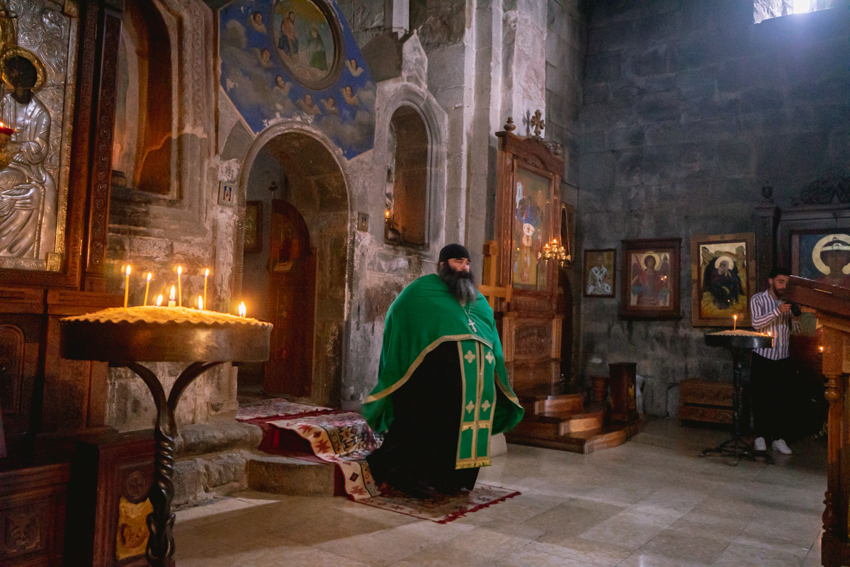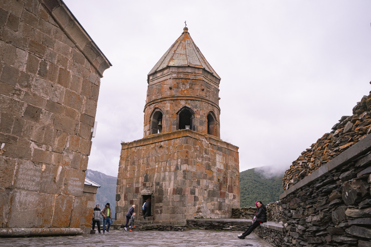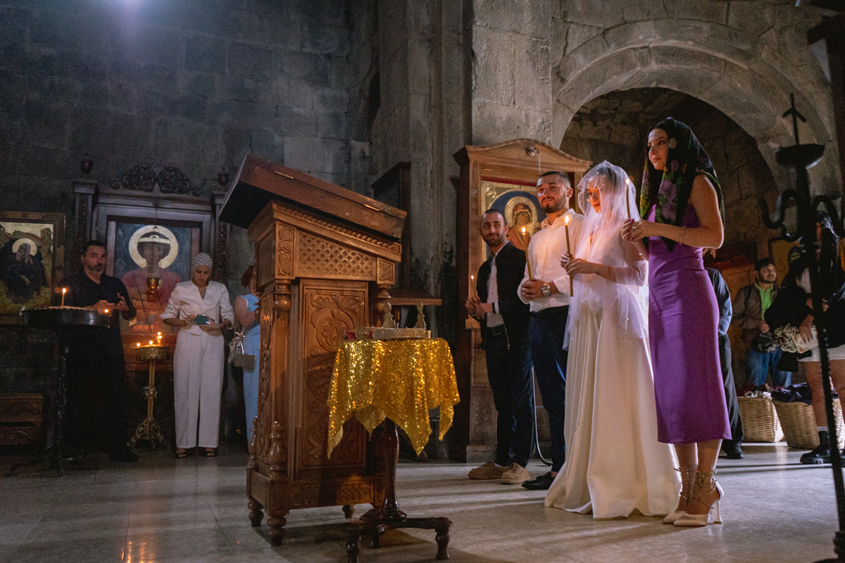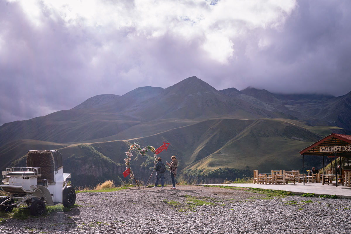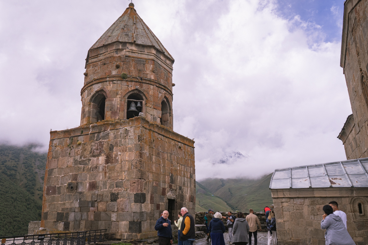 O nome oficial da ‘Noiva’ é Monte Kazbegi e deve a sua alcunha ao facto de passar grande parte do tempo ‘escondido’ por trás de um véu de nevoeiro. Neste templo, à semelhança do que aconteceu no Mosteiro Jvari, o grupo encontrou-se com um casal que estava a celebrar matrimónio.