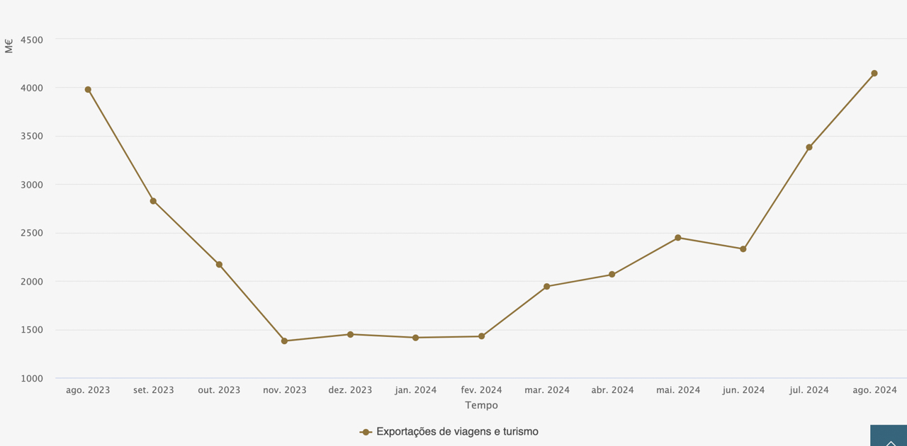 Os gastos de turistas estrangeiros em Portugal, que são contabilizados como exportações de turismo pelo Banco de Portugal, superaram em Agosto, pela primeira vez, os 4.000 milhões de euros, com o total de 4.149,07 milhões.