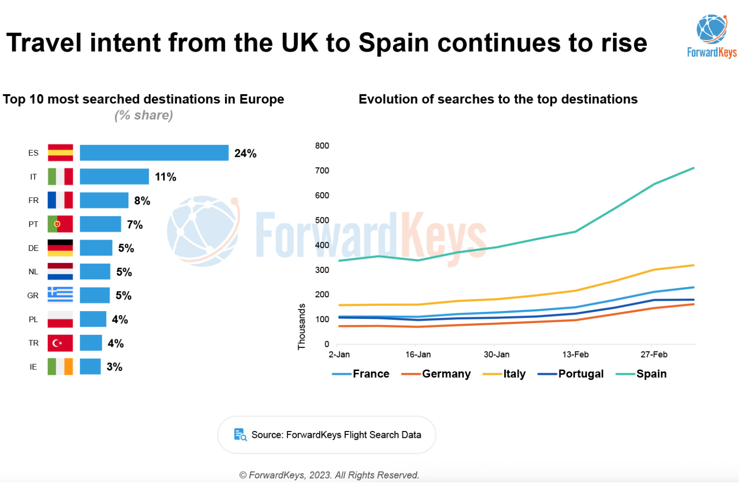 A ForwardKeys, com sede em Espanha, diz ainda que Espanha é o destino nº1, com 24% de todas as pesquisas para a Europa, e que as chegadas do Reino Unido a Espanha deverão aumentar 16% em relação a 2019 e que o grupo mais resiliente são as famílias e grupos de 3 a 5 membros.