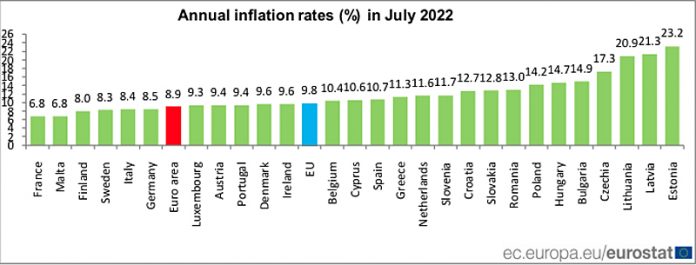 O Eurostat, departamento de estatísticas da União Europeia, informou hoje que a taxa anual de inflação subiu em Julho para 8,9%, apontando como principais causas as subidas de preços da energia, alimentação, álcool e tabaco, serviços e bem industriais.