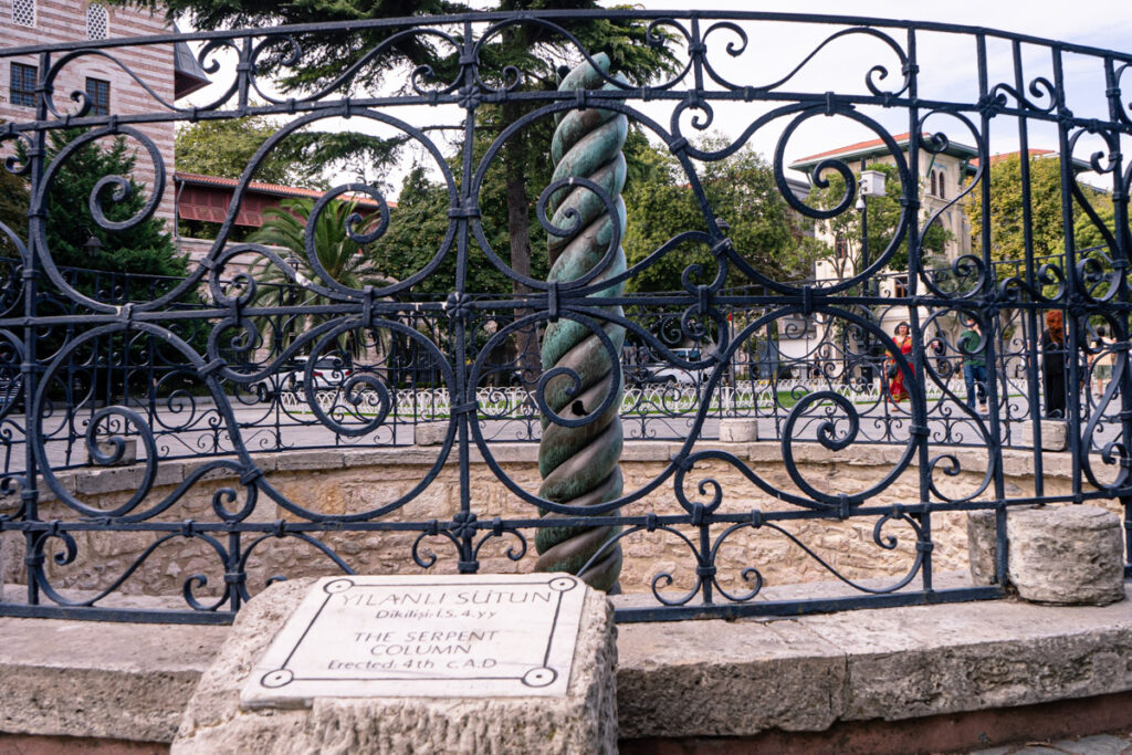 O Hipódromo de Constantinopla, que separa estas duas gloriosas mesquitas, é hoje a Praça Sultanahmet, e ainda tem os monumentos alusivos ao seu passado da era romana, como a Coluna da Serpente, trazida do Templo de Apolo em Delphos, na Grécia, por Teodósio, bem como o Obelisco de Teodósio, trazido do Templo de Karnak no Egipto. Há ainda o Obelisco de Constantino, que chegou a ser coberto em bronze antes do saque da cidade durante a Quarta Cruzada.