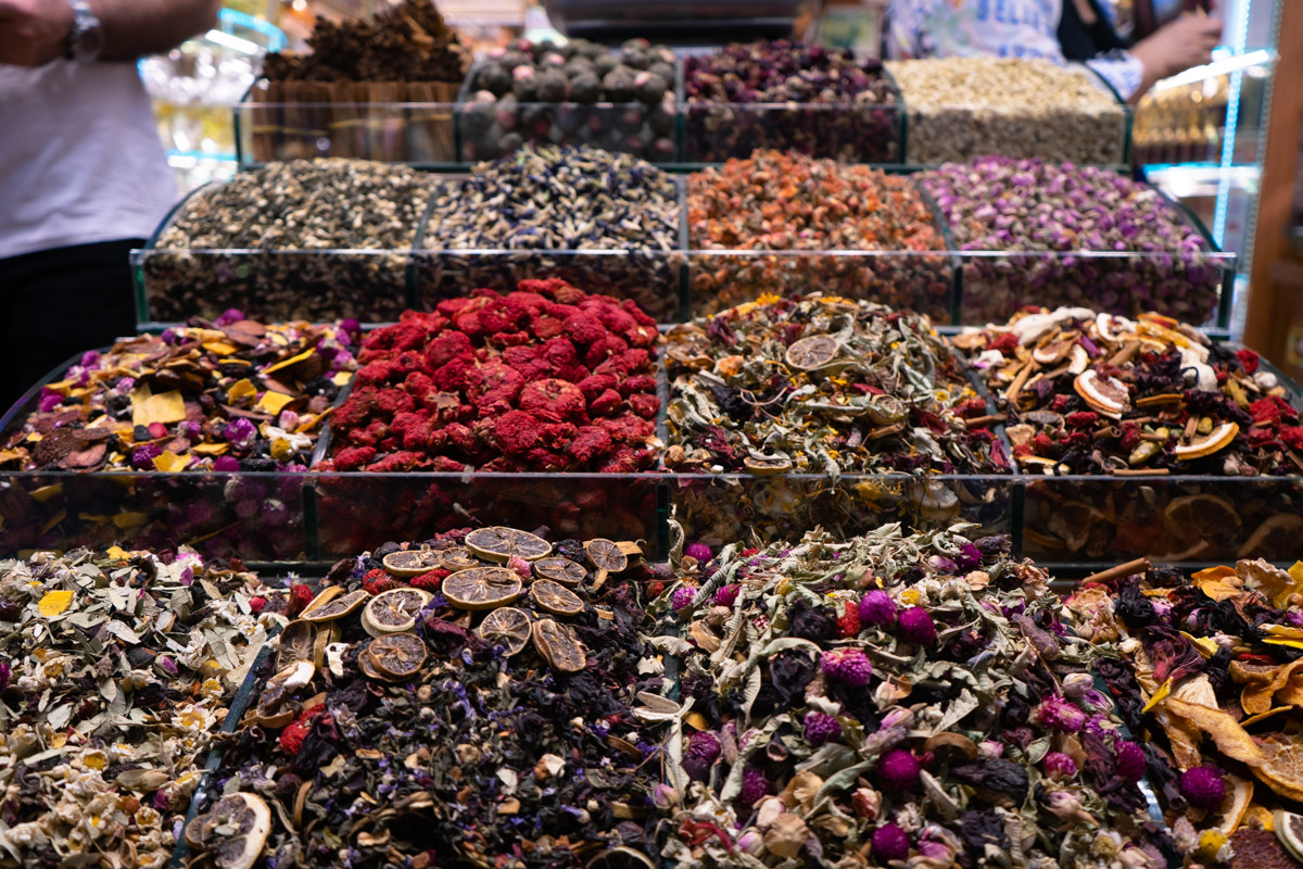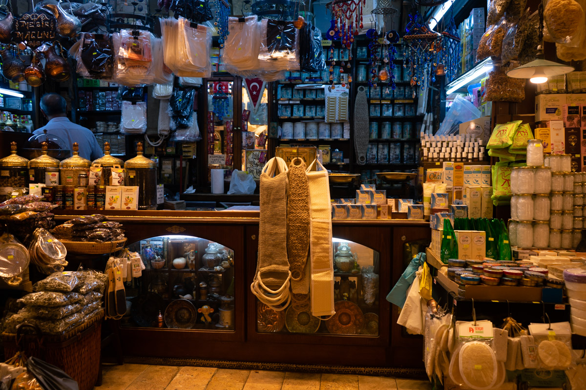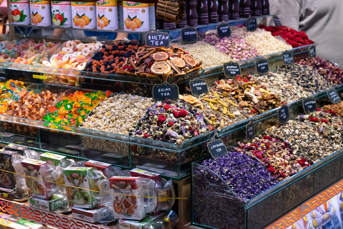 Especiarias, como o nome indica, chás, doces turcos eximiamente acondicionados nas suas embalagens, fruta e frutos secos, apesar de também se encontrarem no Grand Bazaar, são os produtos em destaque no Bazaar das Especiarias.