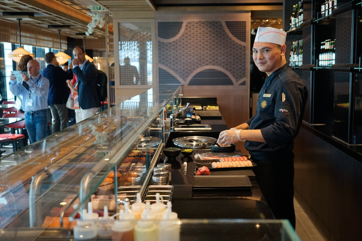 Os passageiros têm acesso a uma panóploa de experiências gastronómicas requintadas, como o restaurante Anthology, que funciona de forma rotativa com chefs galardoados com estrelas Michelin, ou o Astern, junto de uma das piscinas. Em relação a bebidas, estão incluídas, e a viagem começa com uma garrafa de champagne e uma de licor para as boas-vindas.