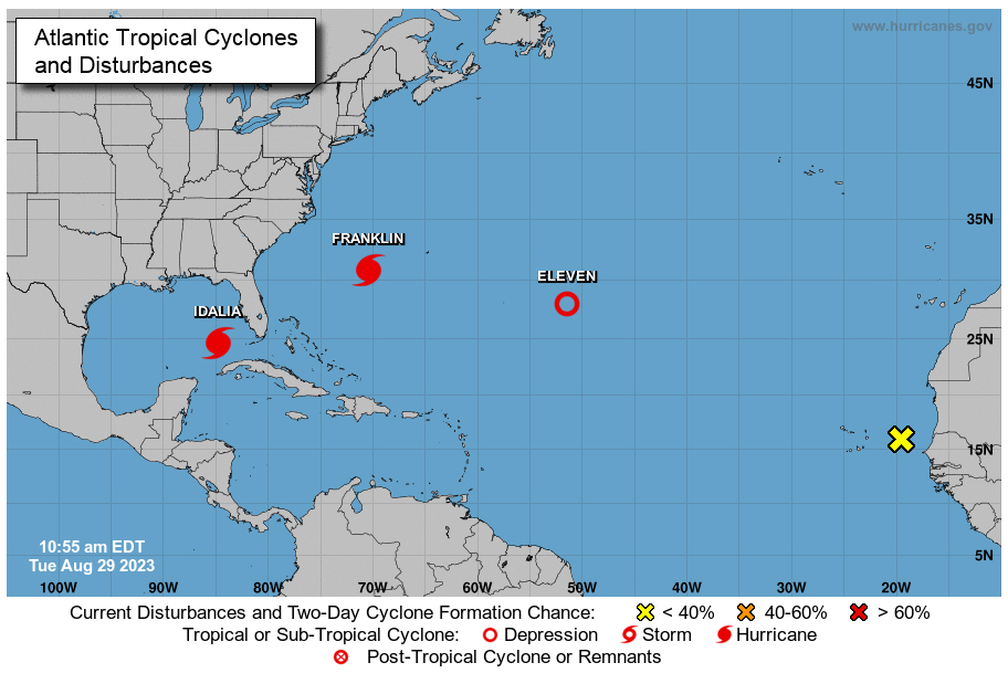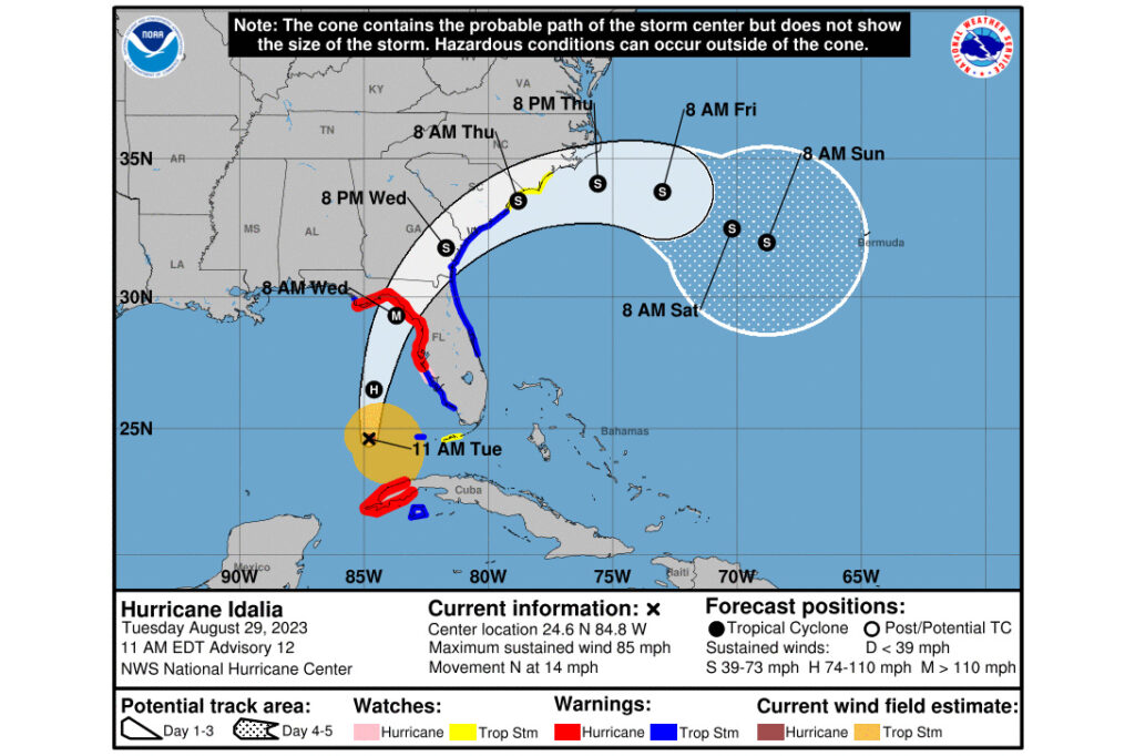 O NHC alertou ainda para a possibilidade de ventos com capacidade de destruição e de colocar vidas em risco à medida que o centro do furacão Idália se move para terra na região do Big Bend da Flórida, sendo esperadas condições de furacão noutras zonas da costa do Golfo da Flórida.