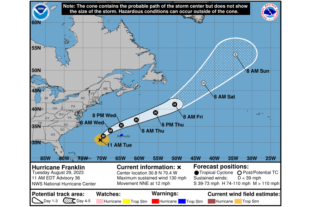 O NHC também actualizou a informação sobre o furacão Franklin às 16h (hora de Lisboa), que se encontra a 555 quilómetros a Oeste-Sudoeste das Bermudas, a mover-se para Norte-Noroeste a 19 quilómetros por hora.