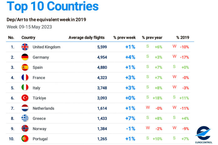 A informação é do Eurocontrol e mostra o Reino Unido como o país com mais voos in e out, com 5.599, seguido pela Alemanha, com 4.954, e Espanha, com 4.880.