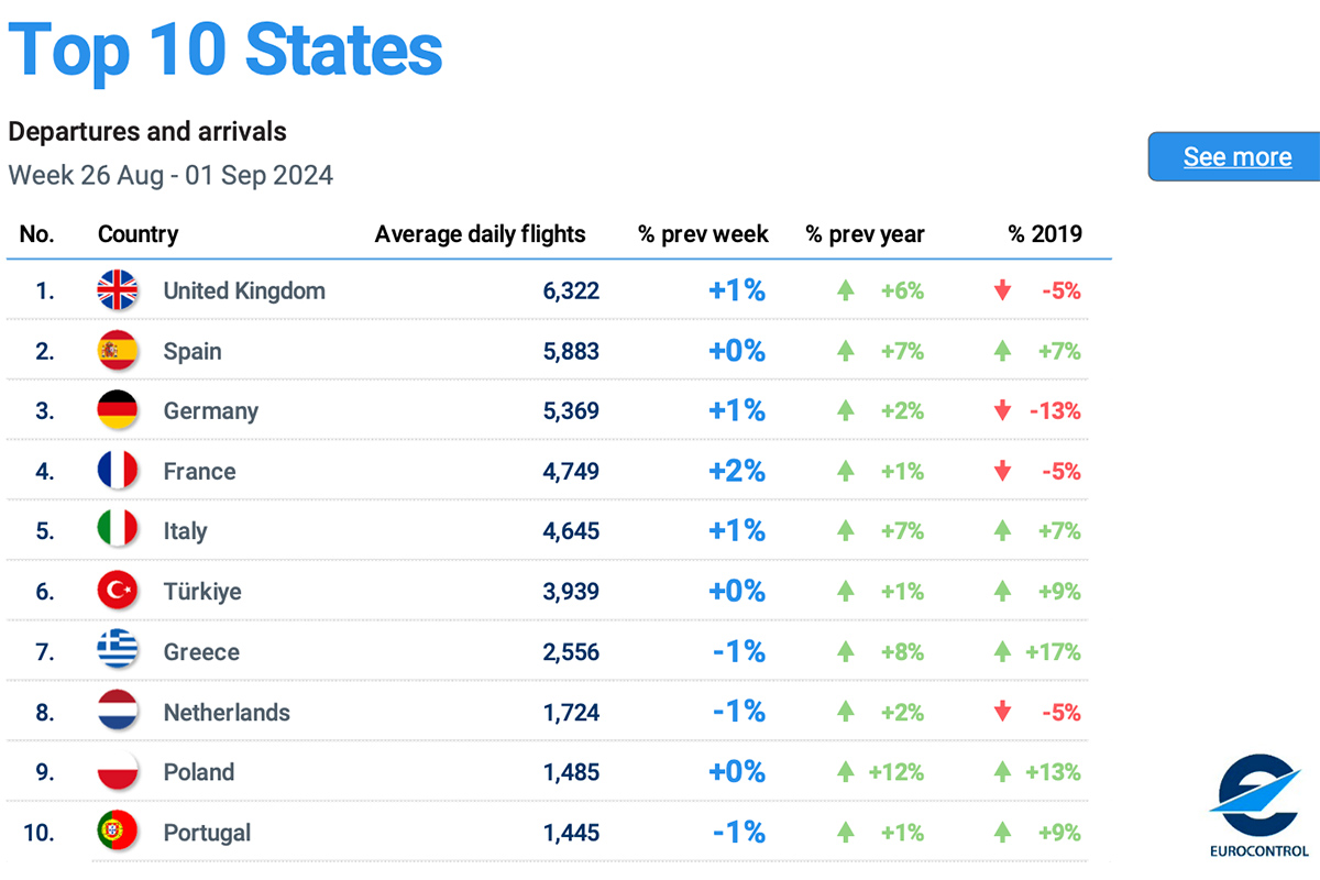 O Eurocontrol indicou que a média diária de voos foi superior em 9% à da semana homóloga de 2019, que é o terceiro melhor desempenho dos dez Estados com informação, aquém apenas dos +17% da Grécia e dos +13% da Polónia e a par da Turquia (+9%).