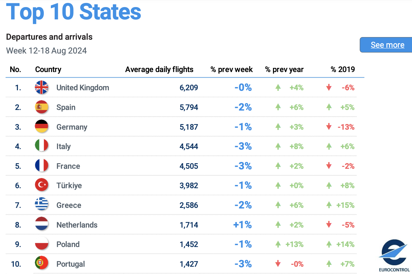 Os dados mostram que, no entanto, em comparação com a semana anterior, a tendência dominante foi de redução do número de voos, com uma única excepção, os Países Baixos, no Top10, liderado por Reino Unido, com 6.209 voos diários, Espanha, com 5.794, Alemanha, com 5.187, Itália, com 4.544, e França, com 4.505.