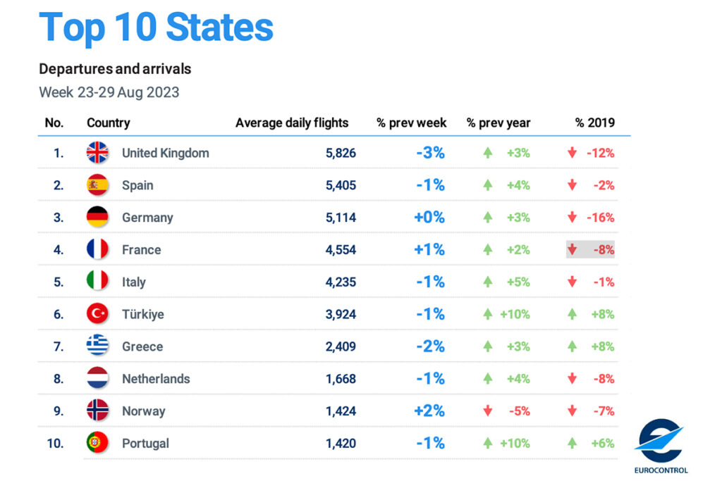 Relativamente à semana homóloga de 2019, a Alemanha tem a maior quebra do número de voos, em 16%, seguida pelo Reino Unido, com -12%, em que três pontos percentuais são considerados consequência da avaria no controle de tráfego aéreo, e França e Holanda, ambos com queda em 8%.