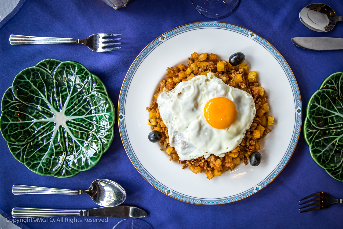 • Um dos pratos mais conhecidos é o Minchi ao Estilo de Macau, um prato de carne picada com batatas fritas, cebola e queijo, para comer após misturar um ovo estrelado;