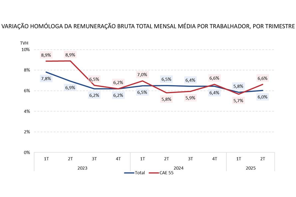 A informação divulgada hoje sublinha que a remuneração bruta mensal média por trabalhador ao serviço (por posto de trabalho) em actividades de alojamento (CAE 55) alcançou os 1.370 euros no segundo trimestre.