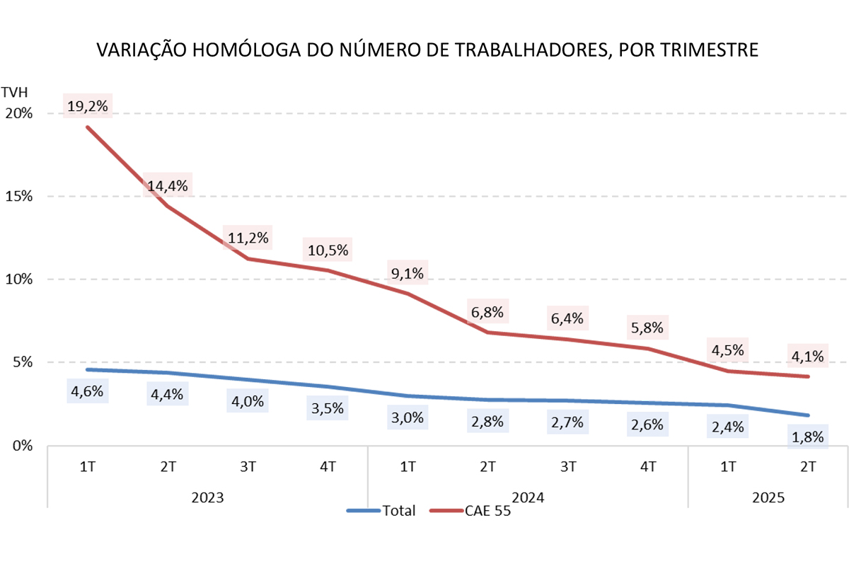 Os dados abrangem 4,8 milhões de postos de trabalho, correspondentes a beneficiários da Segurança Social e a subscritores da Caixa Geral de Aposentações, mais 1,8% que no período homólogo do ano passado e mais 2,4% que no primeiro no trimestre deste ano. Nas actividades de alojamento estavam abrangidos 105,7 mil postos de trabalho (+4,1%, após +4,5% no trimestre anterior).