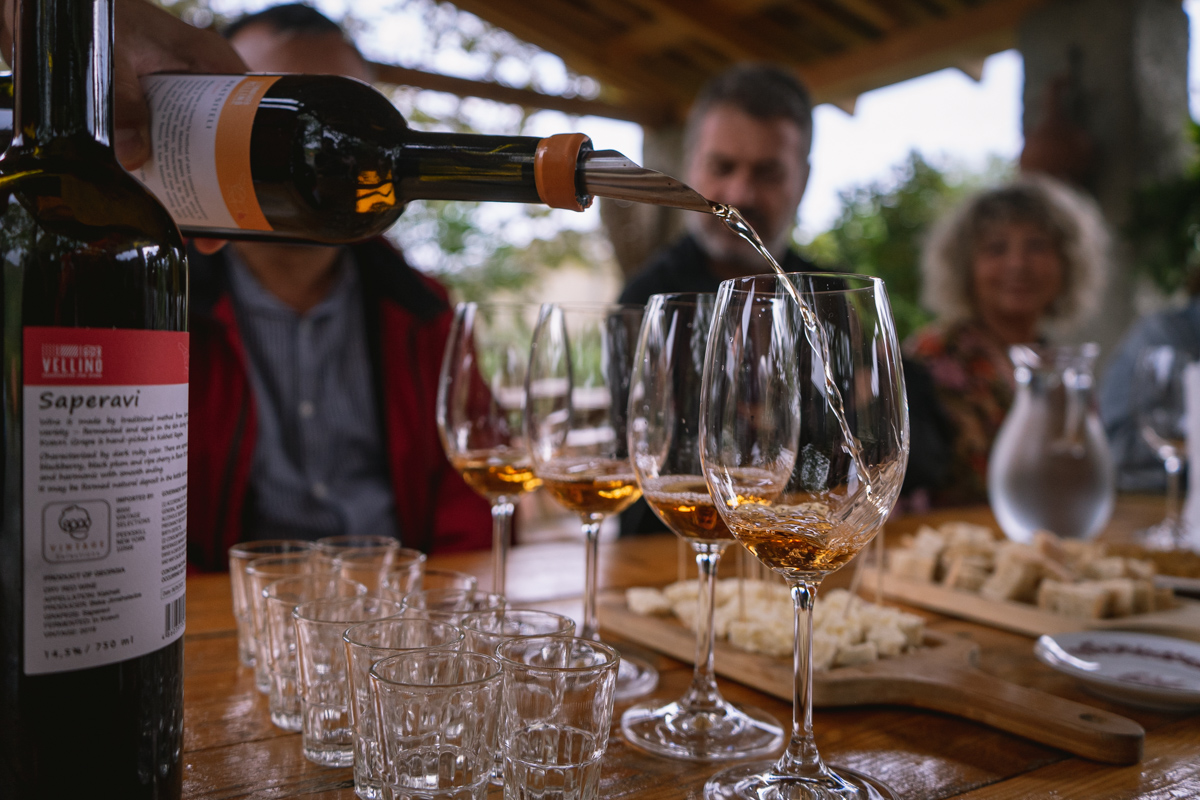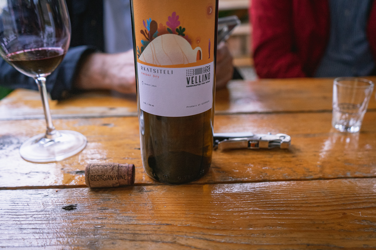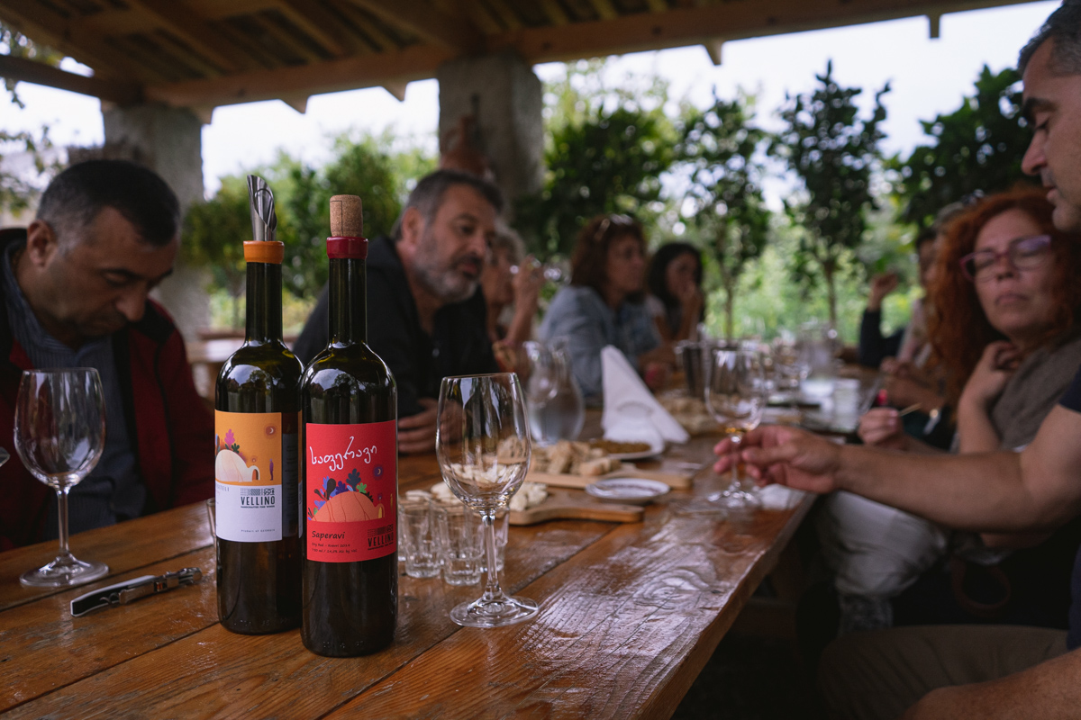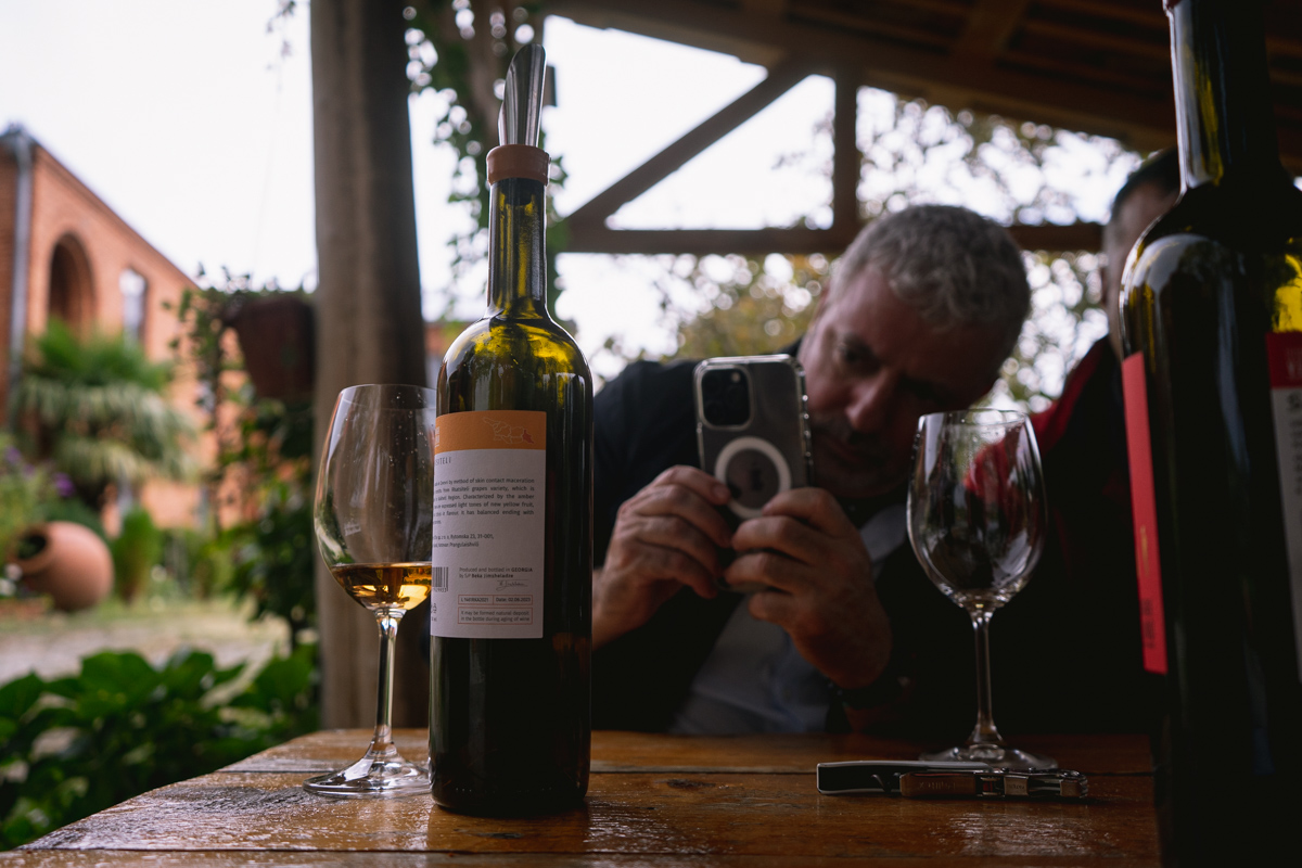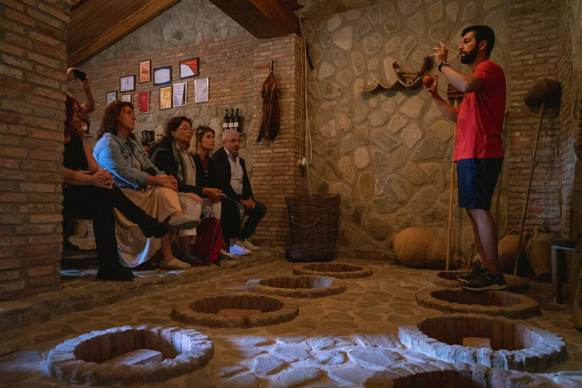 Fomos inicialmente recebidos pelo cão Dobby, o animal de estimação da adega, que antecedeu a chegada de Beka, o proprietário, que nos recebeu e apresentou o processo através do qual faz os seus vinhos qvevri e as suas destilações, uma bebida ao estilo de aguardente denominada chacha. Nesta adega, que tem uma produção de cerca de 15.000 garrafas anuais, fazem-se refeições, provas de vinhos e de chachas, e visitas guiadas.