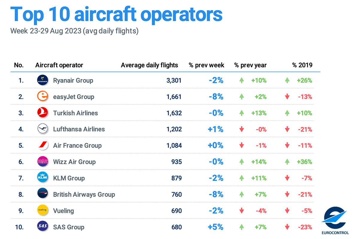 Em relação à semana homóloga do ano passado, o Wizz Air foi o grupo que fez o aumento mais forte do número de voos, em 14%, seguindo-se, ainda com aumentos a dois dígitos, Turkish Airlines, com +13%, KLM, com +11%, Ryanair, com +10%, British Airways e SAS, co, +7% cada, e easyJet, com +2%.