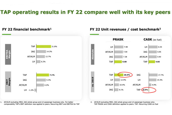 Para a margem EBIT, a TAP indica que em 2022 teve 7,1%, que compara com 5,3% do IAG, 4,2% do Air France KLM e -1,2% do Lufthansa.