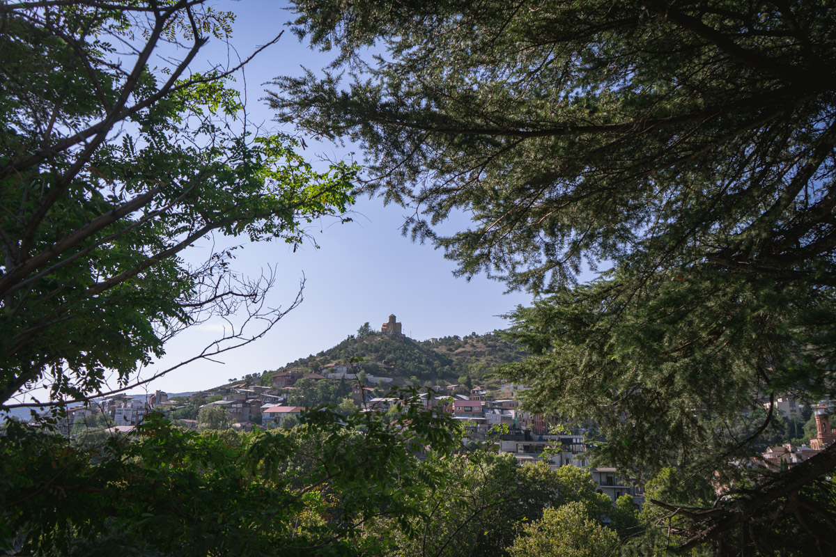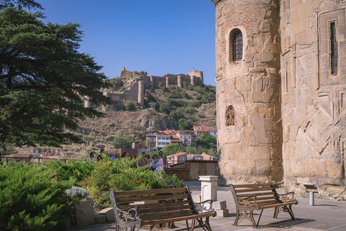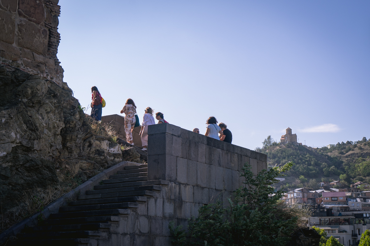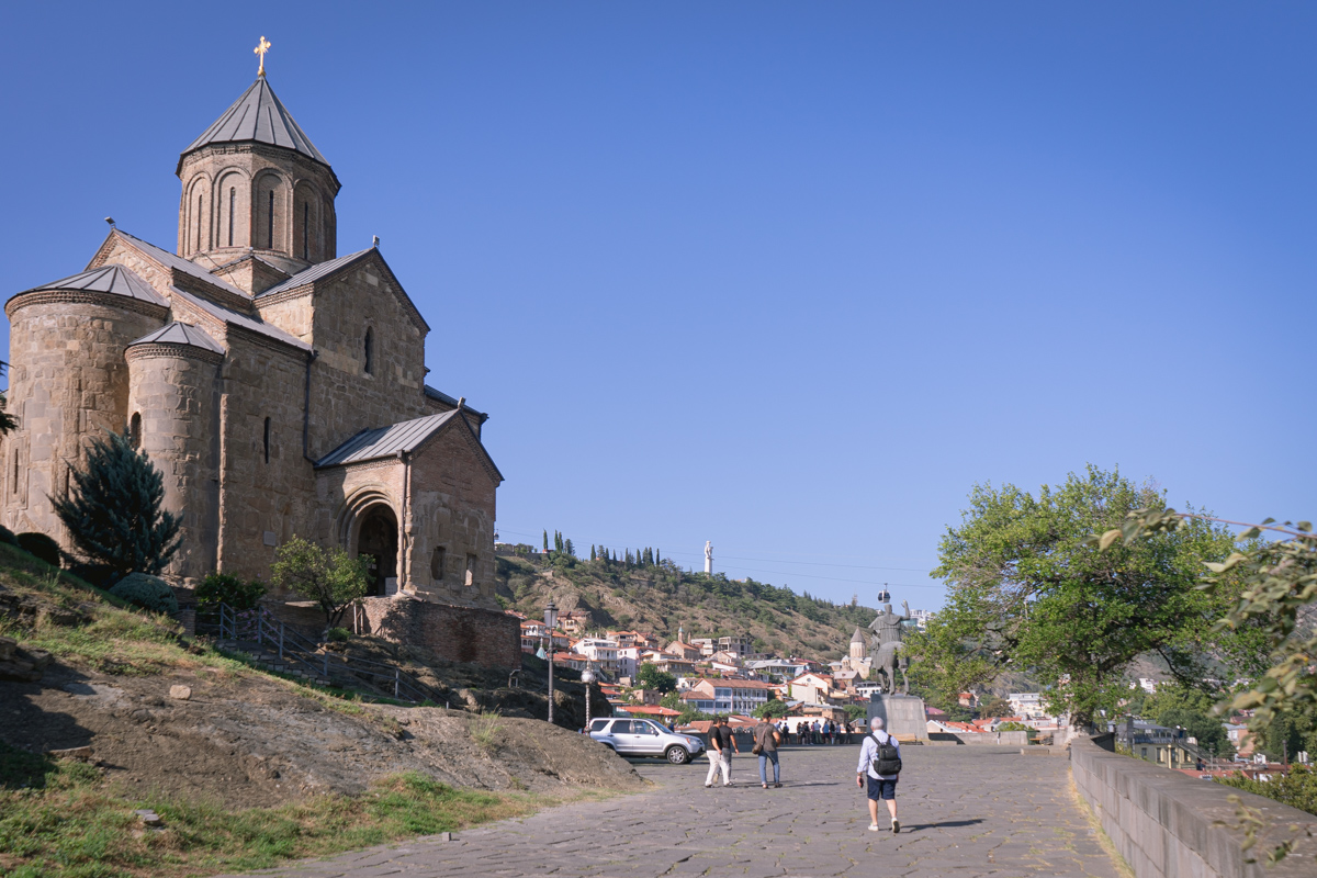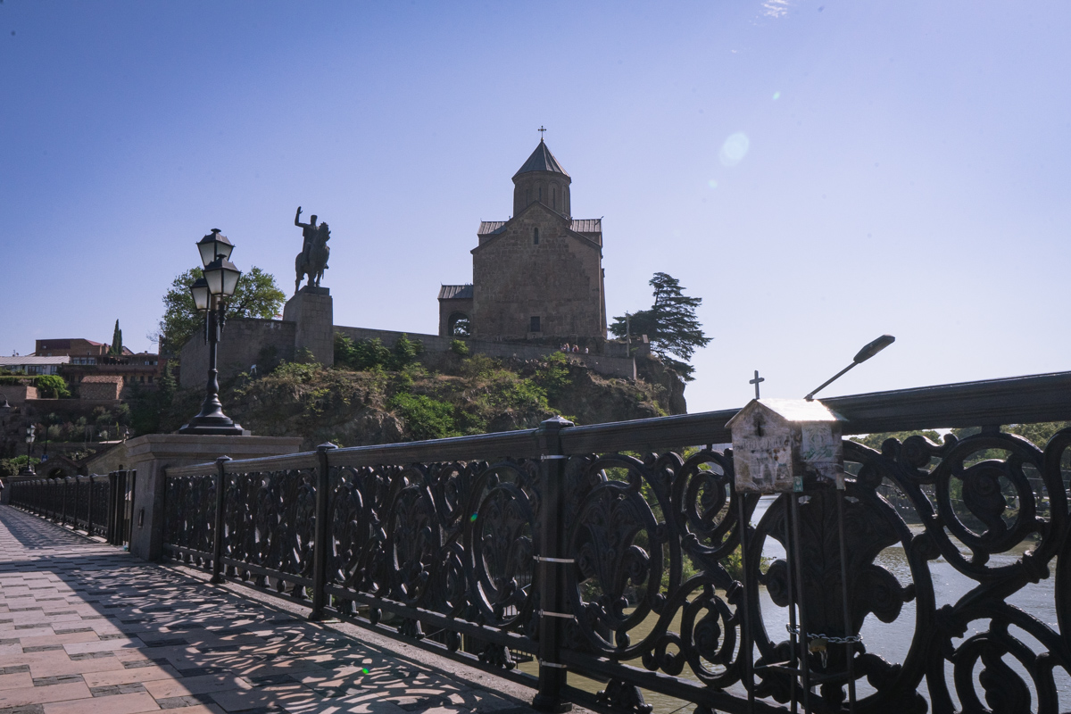 Atravessamos então o rio Cura (Mtkvari) e, na outra margem, no topo de uma colina, observamos a Fortaleza de Narikala, que oferece uma perspectiva abrangente sobre a cidade. Para os mais aventureiros, pode ser apreciada numa pequena viagem de teleférico.