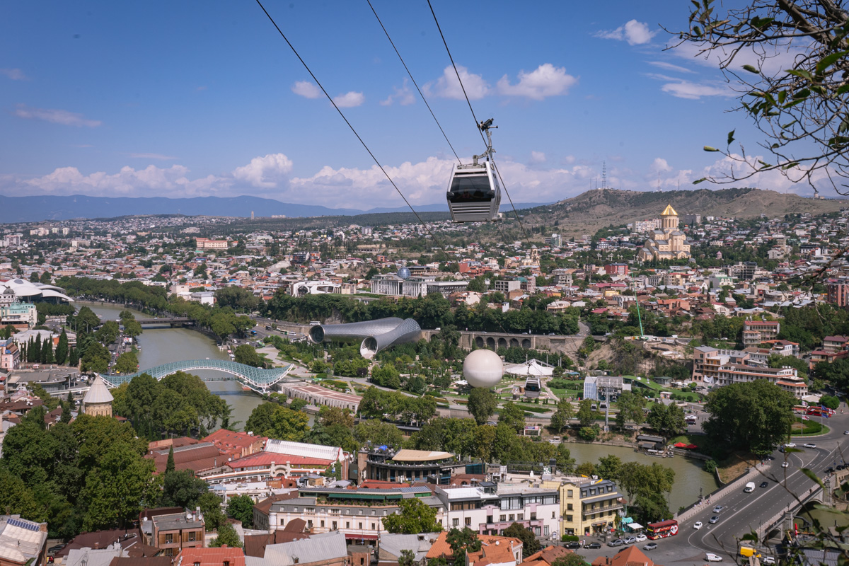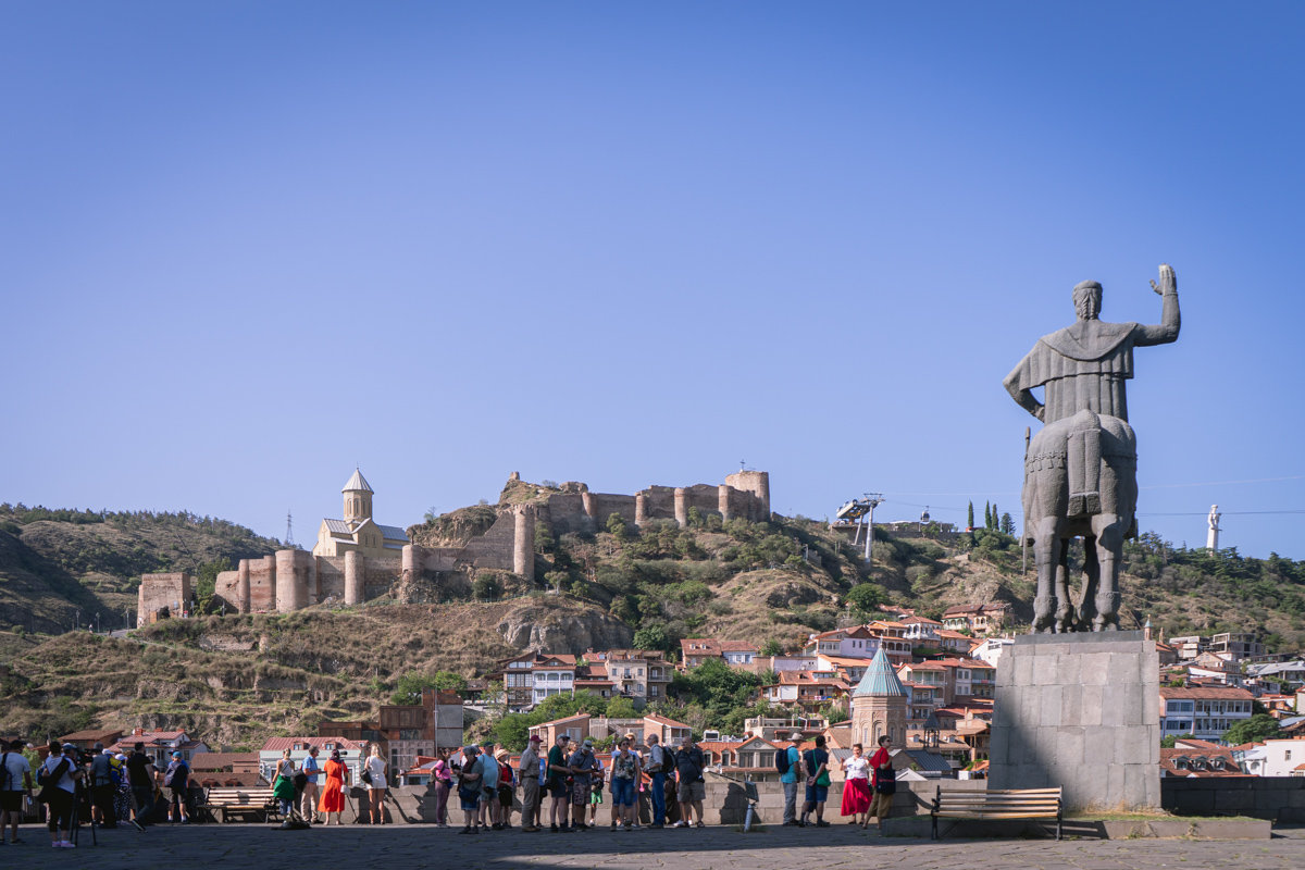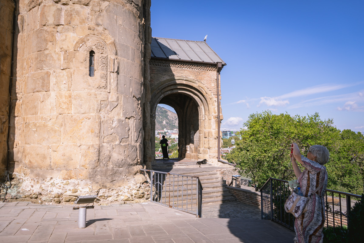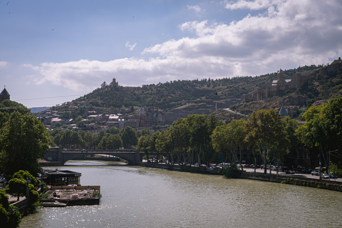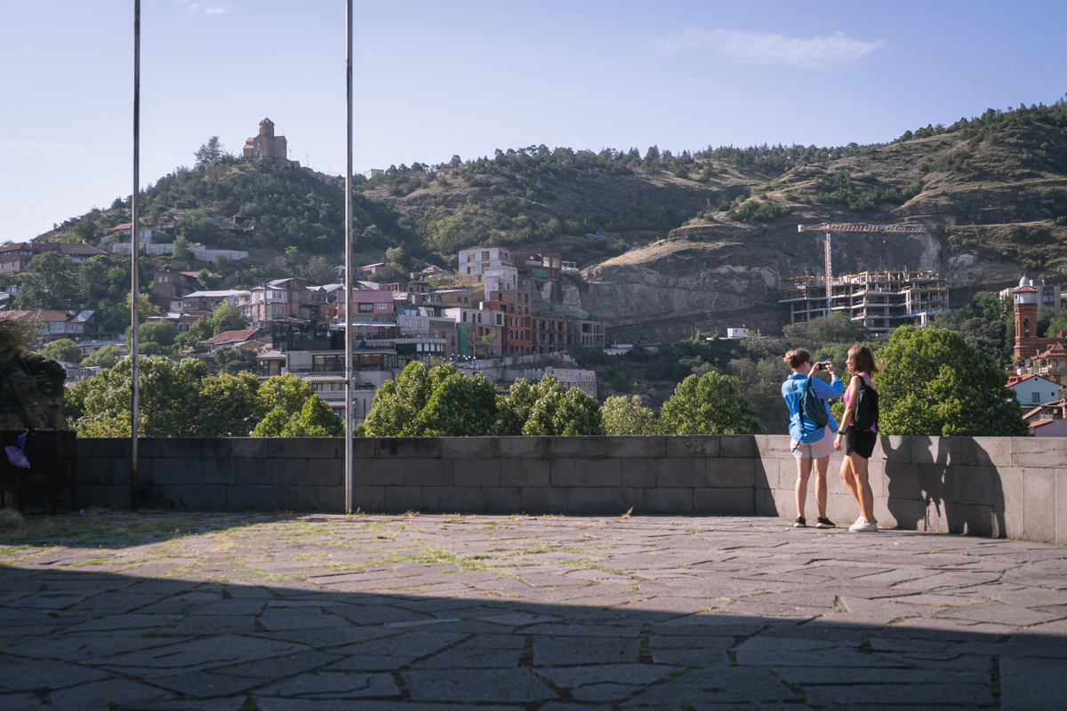 Atravessamos então o rio Cura (Mtkvari) e, na outra margem, no topo de uma colina, observamos a Fortaleza de Narikala, que oferece uma perspectiva abrangente sobre a cidade. Para os mais aventureiros, pode ser apreciada numa pequena viagem de teleférico.