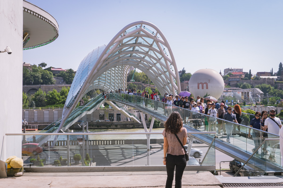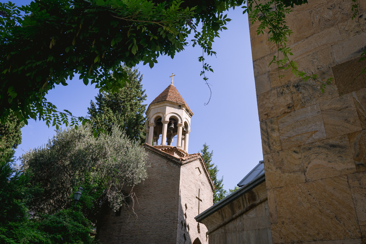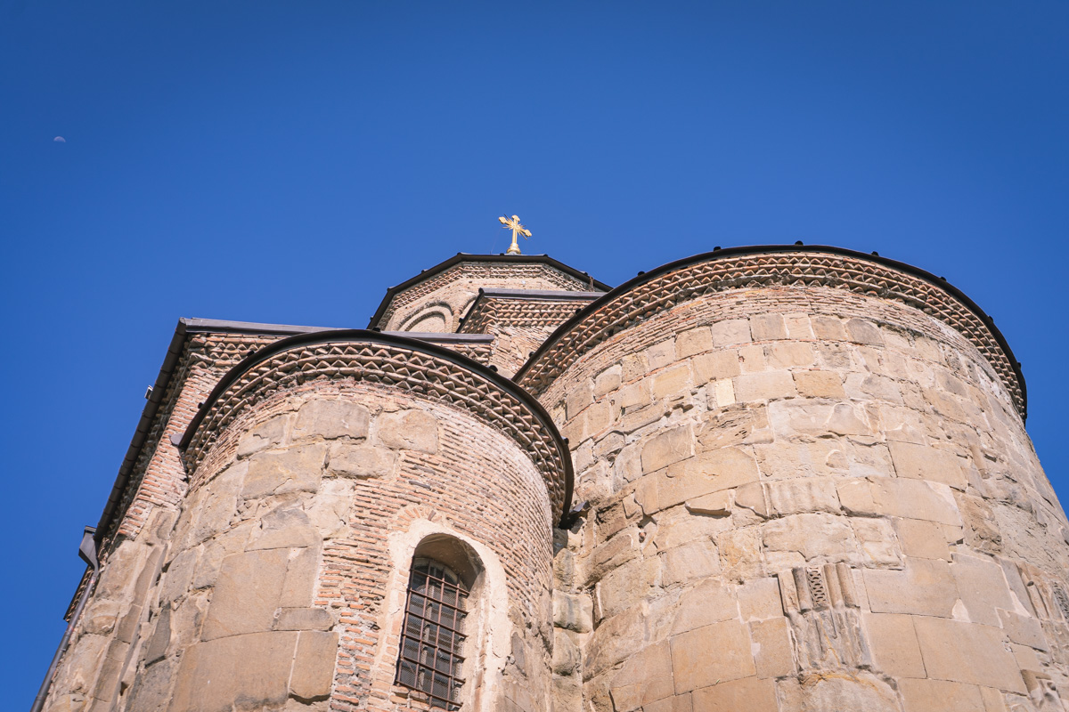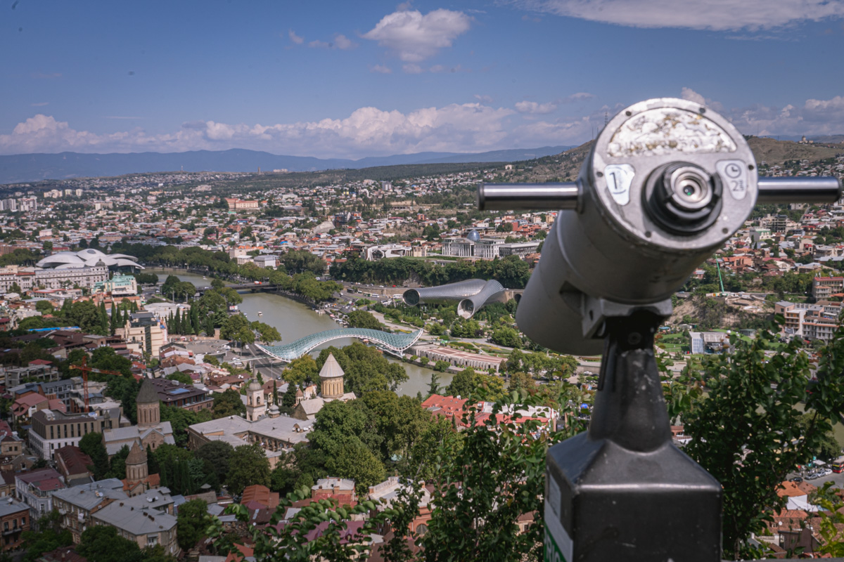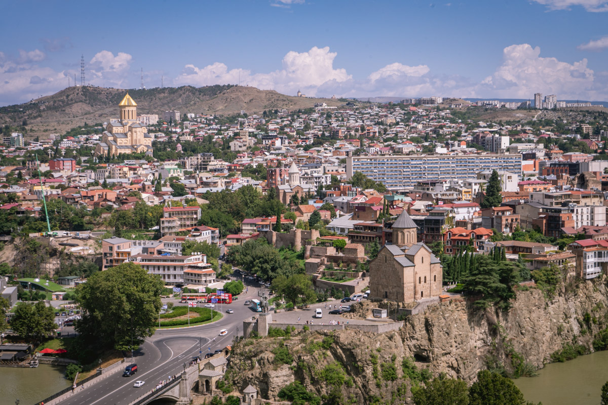 Atravessamos então o rio Cura (Mtkvari) e, na outra margem, no topo de uma colina, observamos a Fortaleza de Narikala, que oferece uma perspectiva abrangente sobre a cidade. Para os mais aventureiros, pode ser apreciada numa pequena viagem de teleférico.
